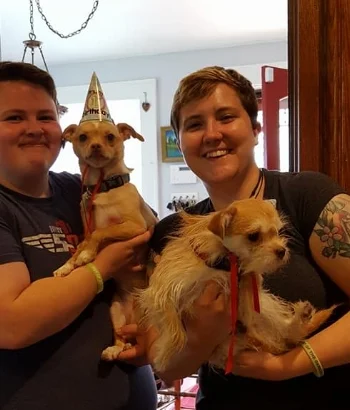 Billie and Binx are the only two pups from a litter belonging to Laura's dogs. Around the time of their birth, Kelsey and I had been not-too-seriously looking at shelter pups. In true lesbian fashion, we had our eyes on a sweet pitbull girl named Tulip (if you're out there, Tulip, we still love you and hope you're doing well). But two pups in the hand are worth one in the pound, right? So we agreed we'd take the puppies once they'd been weaned.